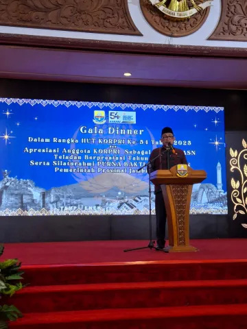 Ketua Dewan Pengurus KORPRI Provinsi Jambi yang sekaligus Sekretaris Daerah Provinsi Jambi Bapak DR. H. Sudiman, SH., MH. membuka acara Gala Dinner dalam rangka Hari Ulang Tahun Korpri yang ke 54, sekaligus menjadi malam Apresiasi Anggota KORPRI sebagai ASN Teladan Berprestasi Tahun 2025 serta malam silaturahmi Purna Bhakti ASN Pemerintah Provinsi Jambi Tahun 2025.